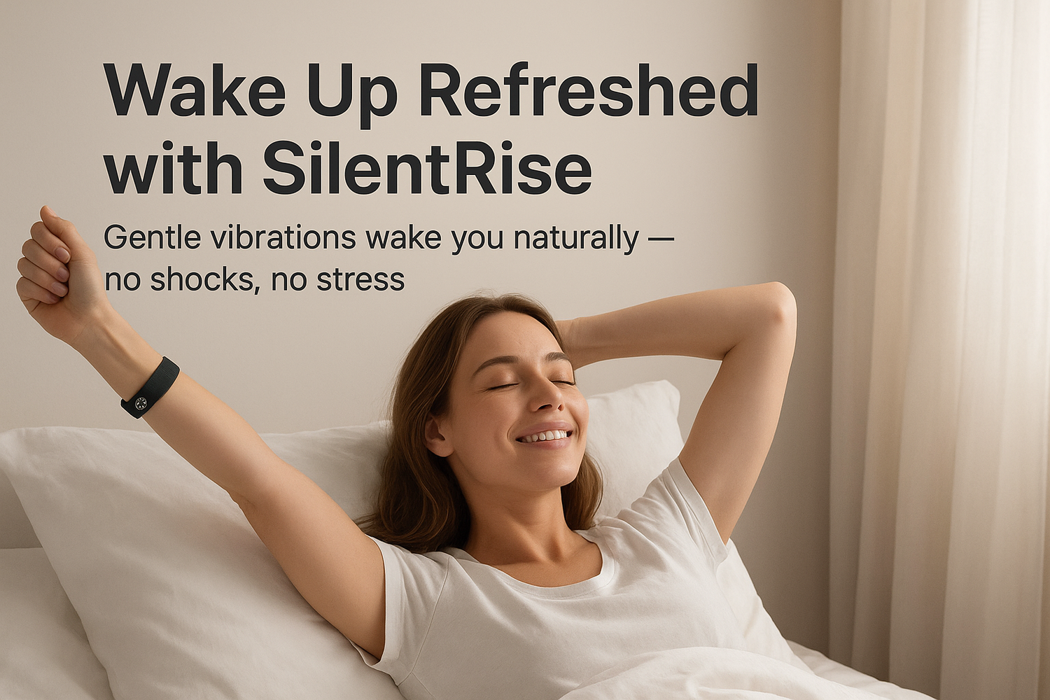 Traditional alarms blast noise that jolts your body awake, spiking stress hormones and leaving you groggy. SilentRise uses gentle wrist vibrations that work with your body’s natural rhythms to wake you smoothly. The result? You open your eyes feeling calm, refreshed, and ready to take on the day.