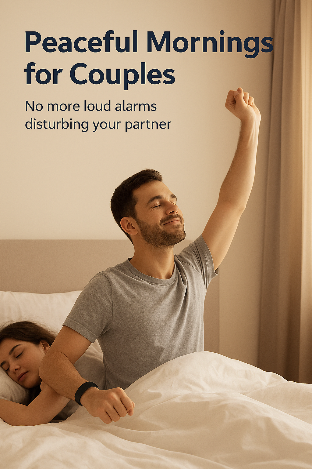 Loud alarms don’t just wake you — they wake everyone. That means arguments, frustration, and disturbed sleep for your partner. SilentRise solves this by waking only the person wearing the band. You get up on time while your partner stays peacefully asleep. Happy mornings = happier relationships.