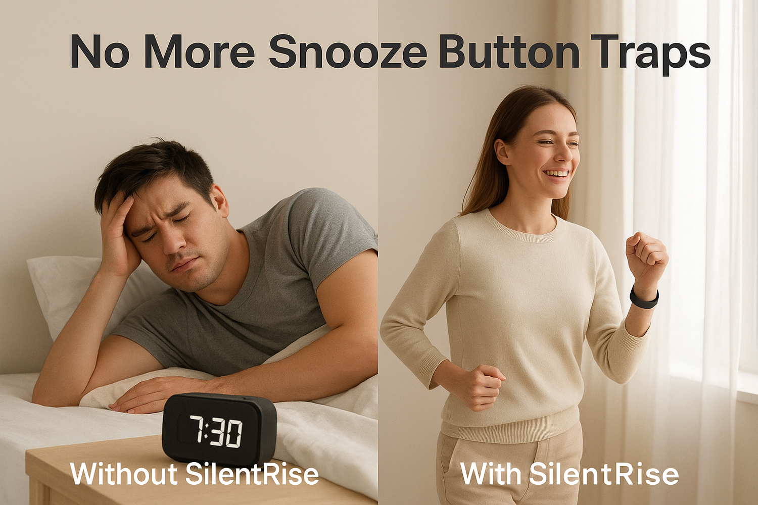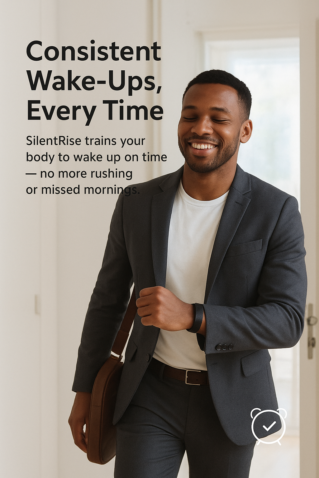 We all know the cycle — alarm goes off, snooze, alarm goes off again, repeat. Before you know it, you’re late, rushing, and stressed. SilentRise is designed to break the snooze habit. The direct vibration on your wrist makes it impossible to ignore, getting you out of bed instantly so you never miss another class, shift, or meeting.
